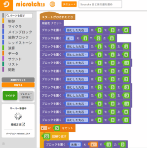 実際の生徒S君のプログラミング画面からです。 こんな風にプログラミングをしていくのが、マイクラッチコースです。